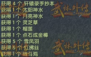 3、任务完成后自动获得物品4个轩辕录手抄本、太阳神水、月亮神水、灵芝草、榴莲、点石成金棒、5个雪凤羽、5个红拂丝、战斗鸡